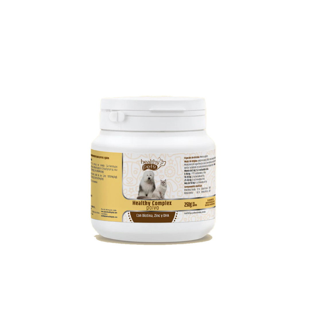 Healthy Complex Pelo Sano es un suplemento nutricional diseñado específicamente para fortalecer el pelo y la piel de perros y gatos. Su fórmula rica en biotina, DHA, zinc y levadura de cerveza aporta los nutrientes esenciales para un pelaje brillante, fuerte y saludable. Es especialmente útil para cachorros en crecimiento, mascotas mayores o animales con piel seca, alergias o calvas.