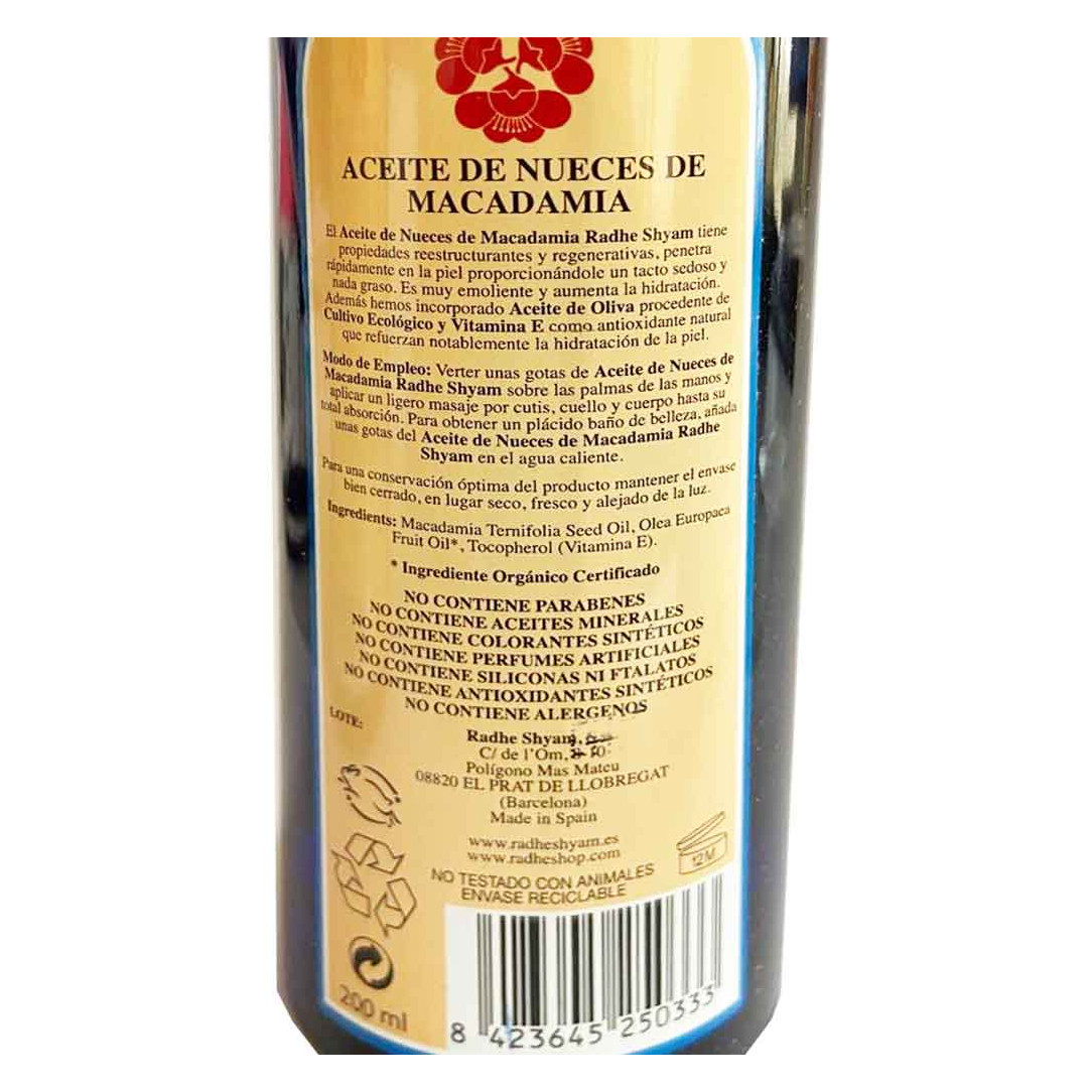 Radhe ShyamAceite natural de macadamia obtenido por prensado en frío, rico en ácidos grasos monoinsaturados que ayuda a regenerar la piel y prevenir los signos del envejecimiento.