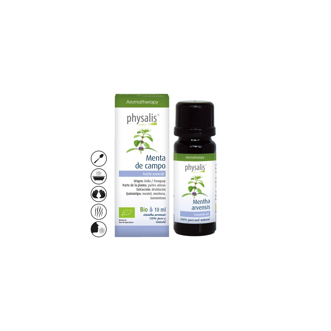 PhysalisAceite esencial puro de hierbabuena bio, rico en mentol. Ideal para aromaterapia, bienestar respiratorio y digestivo. 100% natural y ecológico.