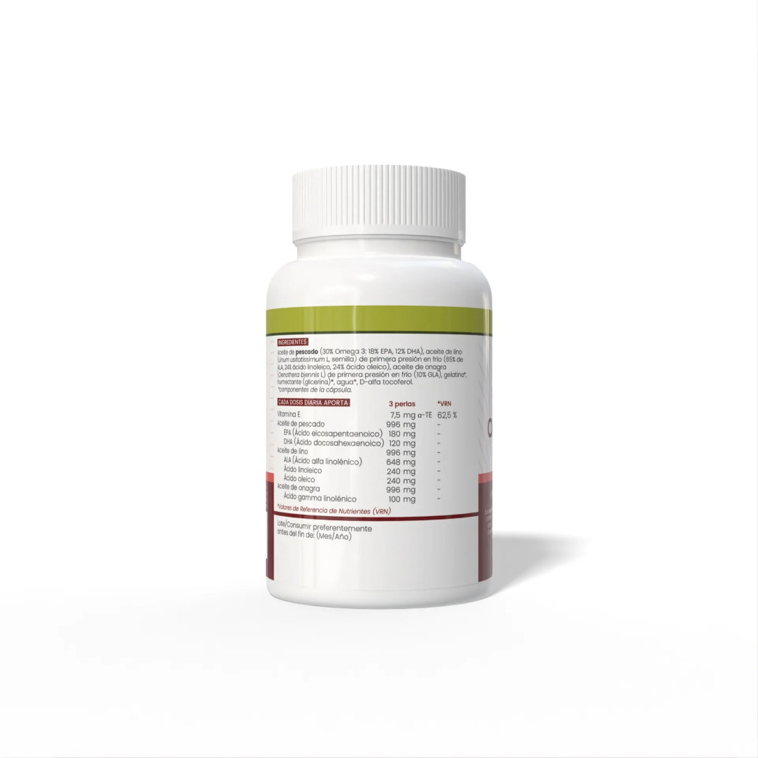 El complemento alimenticio Omega 3, 6 y 9 de Sotya combina aceites de pescado, lino y onagra para aportar una mezcla equilibrada de ácidos grasos esenciales. Esta fórmula está diseñada para apoyar la salud cardiovascular, contribuyendo al funcionamiento normal del corazón gracias a la ingesta de EPA y DHA, y protegiendo las células frente al daño oxidativo gracias a la vitamina E.