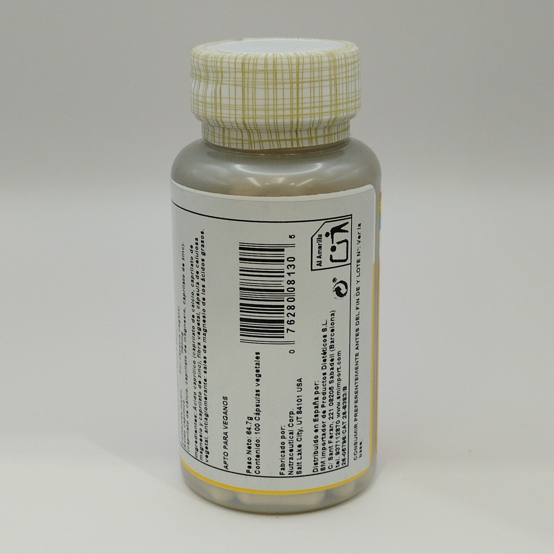 La fórmula de ácido caprílico Capryl de Solaray está formulada con una mezcla especial de calcio, magnesio y zinc que podrían ayudar a mantener un ambiente microbiano saludable. El ácido caprílico contribuye con sus propiedades antibacterianas, antivirales y antifúngicas.