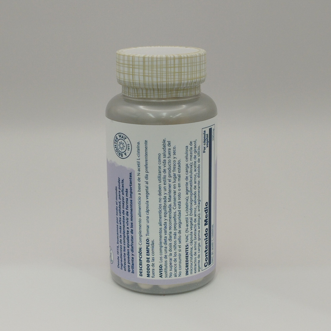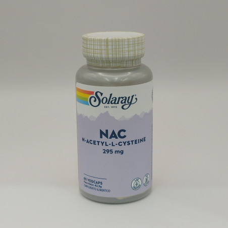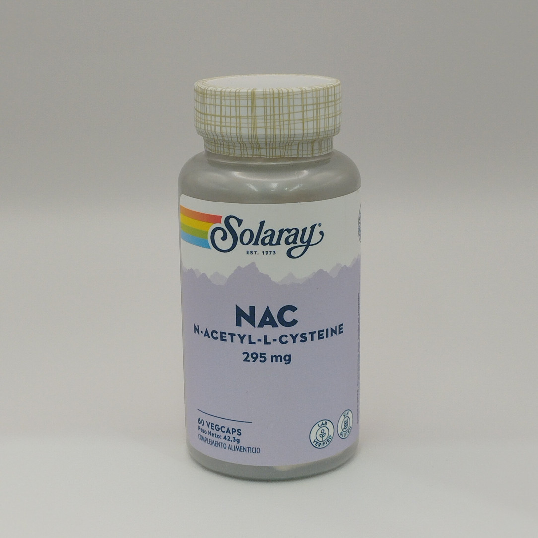 NAC 295mg de Solaray es un complemento alimenticio que aporta N-Acetil-L-cisteína, un aminoácido con función antioxidante que actúa en la formación de estructuras de proteínas y contribuye a la formación de glutatión.