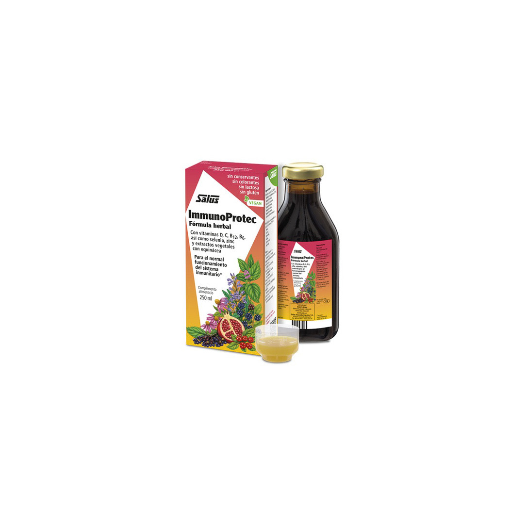 ImmunoProtec de Salus es una fórmula herbal líquida formulada para apoyar el normal funcionamiento del sistema inmunitario y reforzar las defensas del organismo durante todo el año. Su composición combina un extracto acuoso de plantas, entre las que destaca la equinácea (Echinacea purpurea), conocida por sus propiedades inmunomoduladoras. Aporta además un complejo de vitaminas (B6, B12, C, D y E) y minerales (zinc y selenio) esenciales para el óptimo funcionamiento del sistema inmunológico.