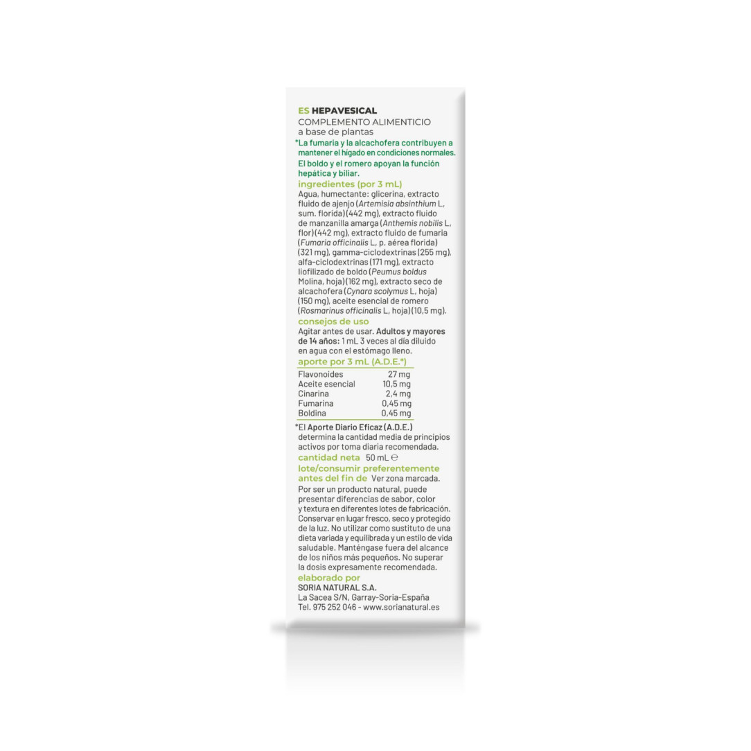 Soria NaturalCombinación de plantas (ajenjo, manzanilla amarga, fumaria, boldo, alcachofera y romero) que contribuye al apoyo de la función hepato-biliar. Con tecnología de ciclodextrinas para mejor absorción.