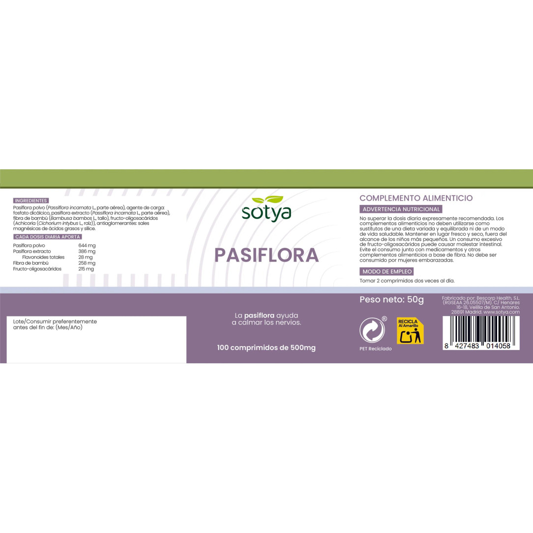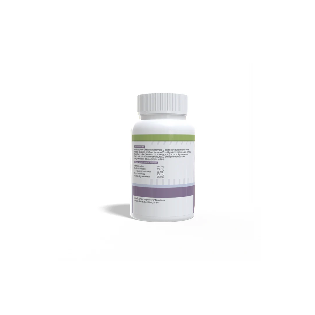 100 comprimidos de 500mg, con extracto estandarizado de Passiflora incarnata (100mg) equivalente a 400mg de fruto. Fructooligosacáridos (250mg) y fosfato dicálcico como agente compresor (150mg)