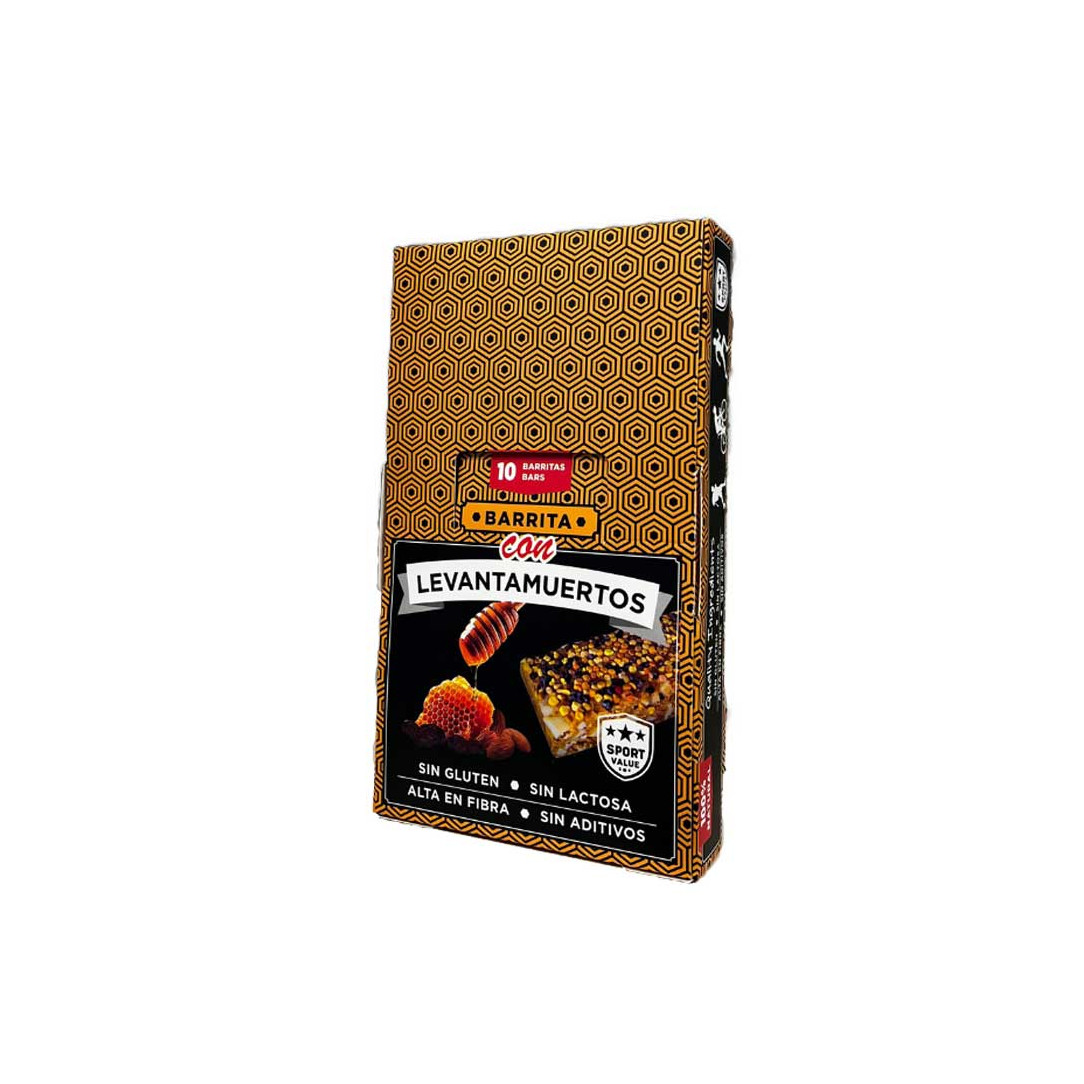 LevantamuertosBarritas energéticas con proteína vegetal, miel cruda, jalea real y polen de abeja. Alto contenido en proteínas (10,5g) para recuperación muscular y energía sostenida con ingredientes 100% naturales.