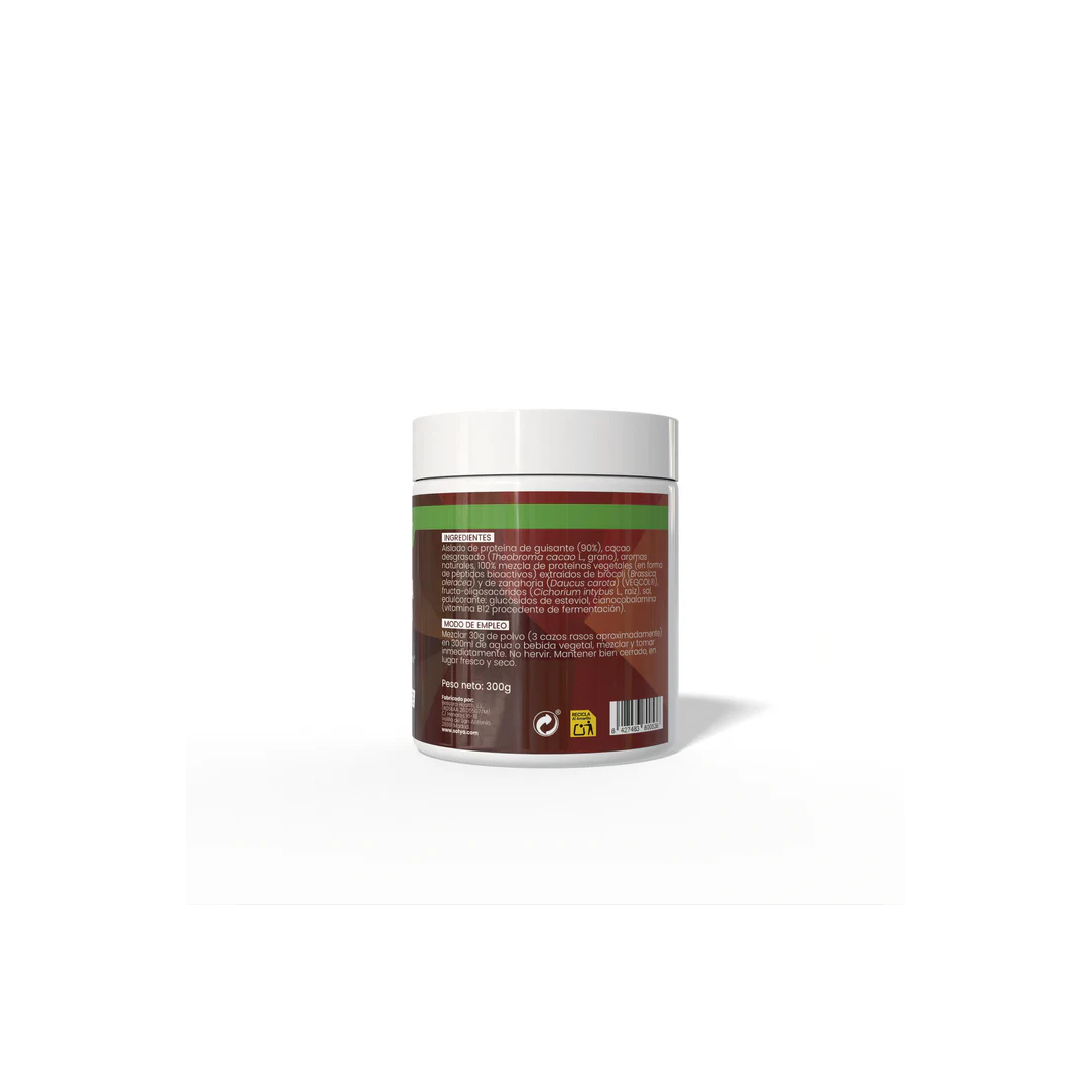 Aislado de proteína de guisante (90%), cacao desgrasado (10%), mezcla de proteína y péptidos vegetales (Vegcol), fructo-oligosacáridos, aroma natural de cacao, glucósidos de esteviol (edulcorante), cianocobalamina (vitamina B12 procedente de fermentación).
