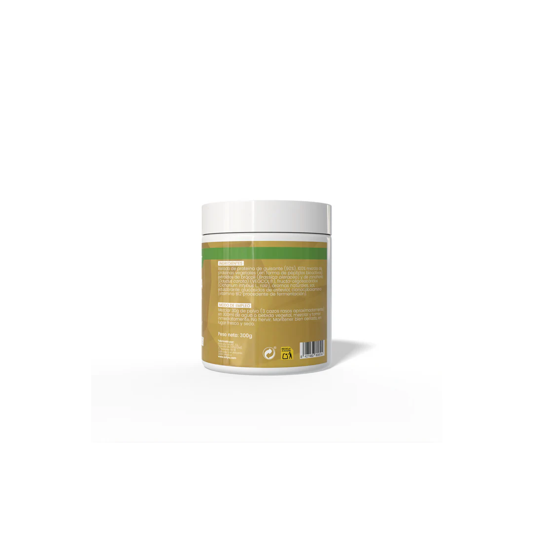 Aislado de proteína de guisante (90%), fructo-oligosacáridos, mezcla de proteína y péptidos vegetales (Vegcol), aroma natural de vainilla, glucósidos de esteviol (edulcorante), cianocobalamina (vitamina B12 procedente de fermentación).