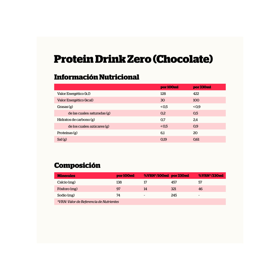 Agua, proteínas de la leche (7,0%), cacao en polvo desgrasado alcalinizado (1,0%), aromas (contienen leche), sal, espesante (carragenanos), estabilizante (fosfato dipotásico), edulcorantes (acesulfamo potásico, ciclamato sódico).