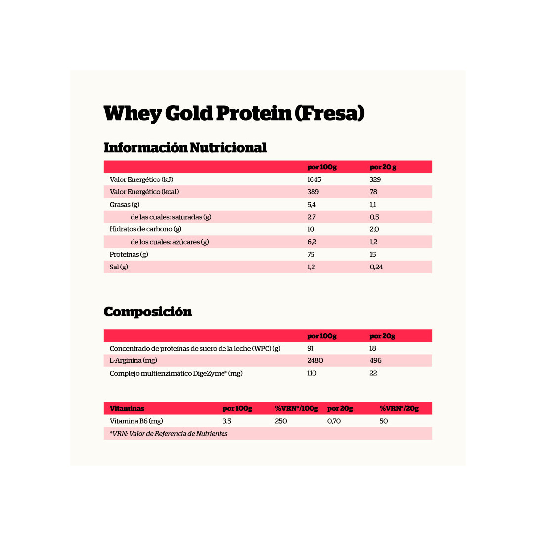 Concentrado de proteínas de suero de la leche (Whey Protein Concentrate) (91%), fresa deshidratada en polvo (4,2%), L-arginina clorhidrato, aromas (contienen leche), sal, edulcorantes (acesulfamo potásico, sucralosa), complejo multienzimático DigeZyme® (0,11%) [alfaamilasa (Aspergillus oryzae), proteasa (Bacillus subtilis), lactasa (Aspergillus oryzae), lipasa (Rhizopus oryzae), celulasa (Trichoderma longibrachiatum), maltodextrina], colorante (E-120), clorhidrato de piridoxina (vitamina B6).