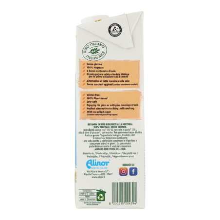 Agua, arroz* 14%, pasta de AVELLANAS* 3%, aceite de semilla de girasol*, sal marina. *De agricultura biológica.