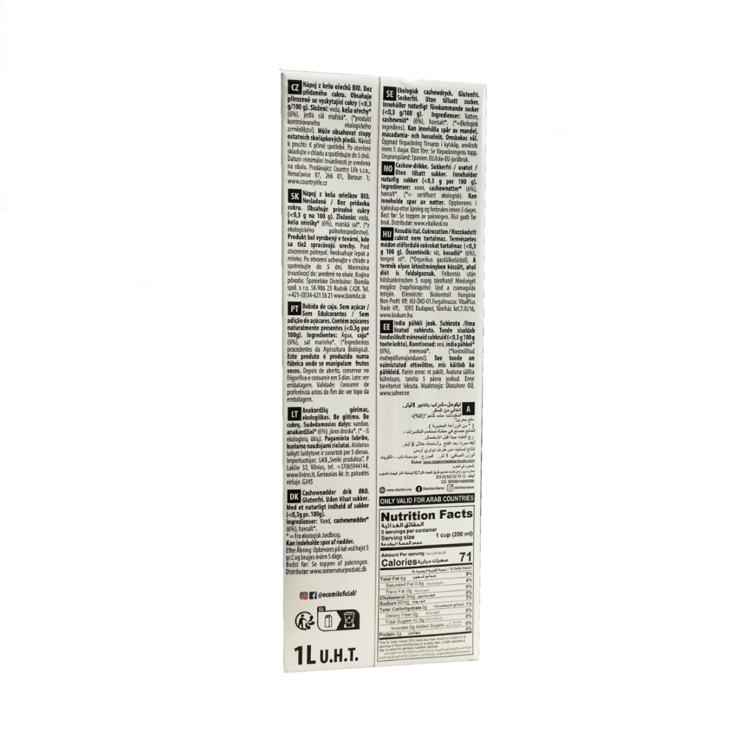 Bebida de Anacardo (cashew) nature sin Azucar Bio 6x1L Ecomil