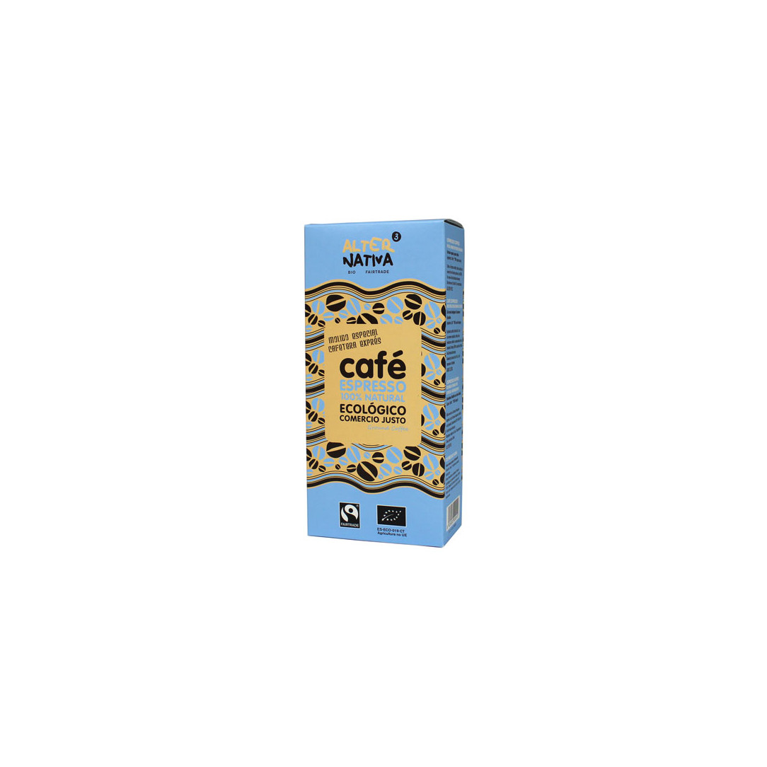 CAFÉ ESPRESSO MOLIDO BIO 250G ALTERNATIVA3Un café blend elaborado a partir de una cuidadosa selección de granos de café ecológico, mezcla de orígenes centroamericanos y africanos, de aroma intenso y buen cuerpo.Un gusto pleno, redondo e intenso, con agradables recuerdos a especias.Un tueste lento y gradual y un molido muy fino, idóneo para cafeteras espresso.Este café ha sido cultivado por grupos campesinos de paises del Sur.