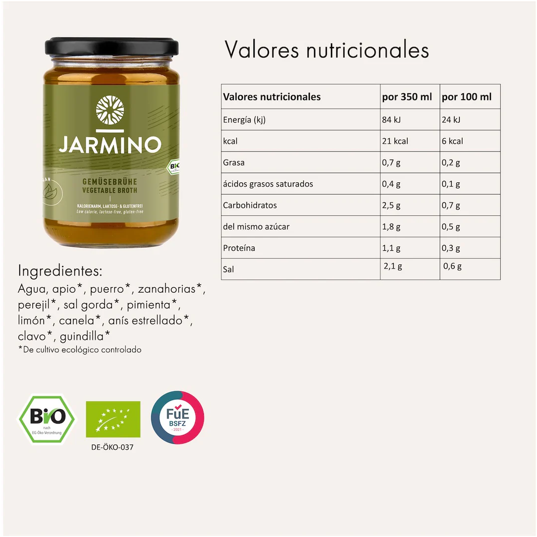 El Caldo de Verduras BIO de Jarmino está elaborado con verduras frescas de cultivo ecológico, siguiendo un proceso artesanal que conserva todo su sabor natural y sus nutrientes. Es una alternativa saludable y baja en calorías frente a los zumos o batidos, ideal para disfrutar como bebida caliente o como base para sopas y salsas. Su equilibrada mezcla de especias, con notas de anís estrellado, canela y clavo, aporta un sabor suave y reconfortante.