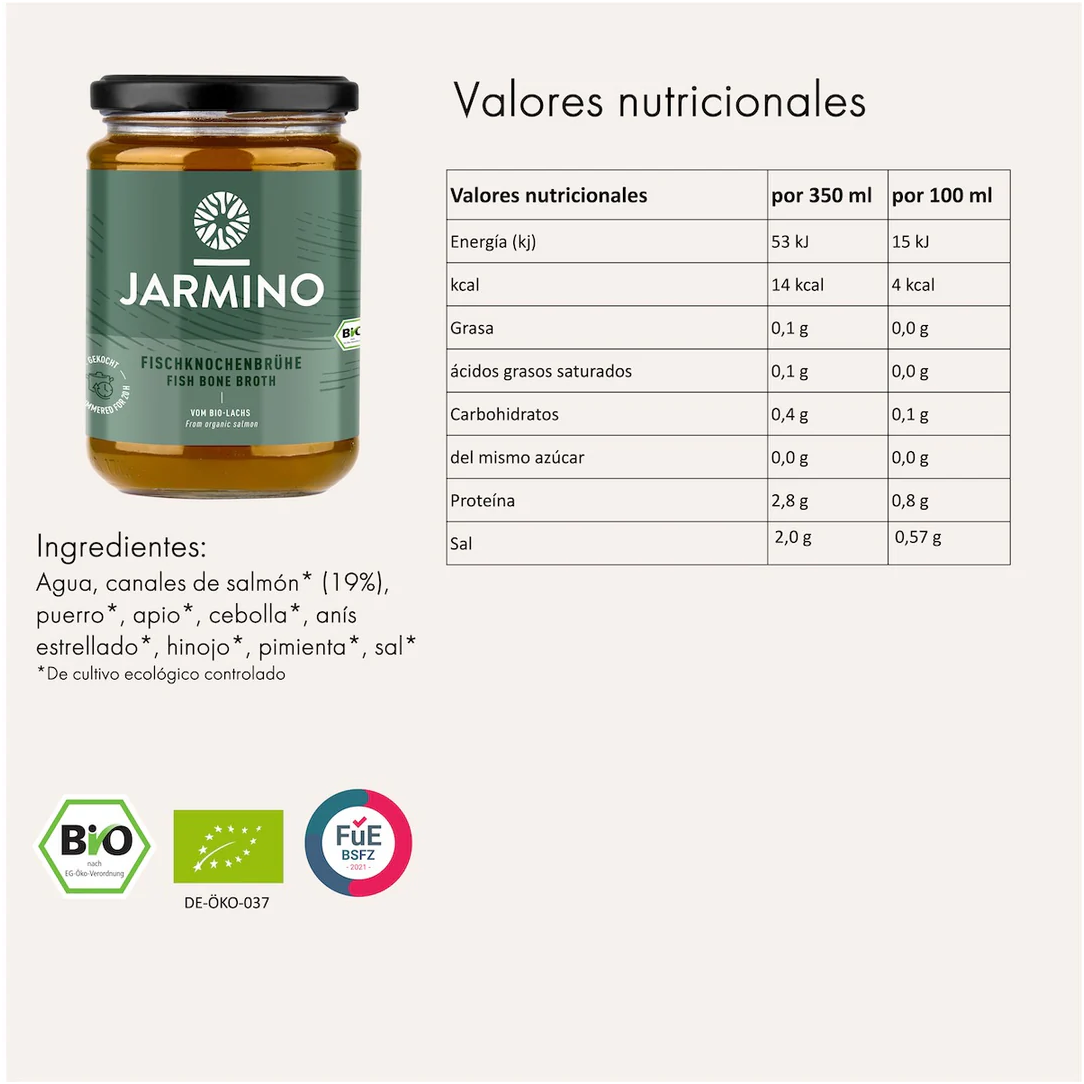 El Caldo de Pescado BIO de Jarmino se elabora a partir de espinas de salmón orgánico procedente de Irlanda, cocidas lentamente durante 20 horas para obtener un caldo rico en nutrientes, minerales y sabor. Su receta, con un toque de anís estrellado, hinojo y apio, ofrece una base gourmet y saludable ideal para sopas, risottos, salsas o para disfrutar solo como bebida reconfortante.