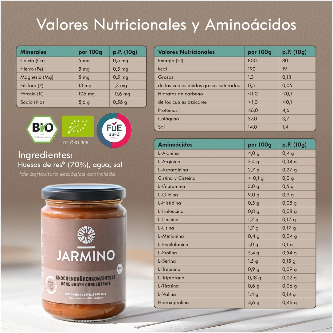 El concentrado de caldo de ternera ecológico de Jarmino se elabora únicamente con huesos de vacuno de pasto, agua y sal. Un fondo de cocina limpio y versátil, rico en proteínas y colágeno, ideal para dar sabor y cuerpo a tus recetas. Cada frasco rinde aproximadamente 22 porciones.