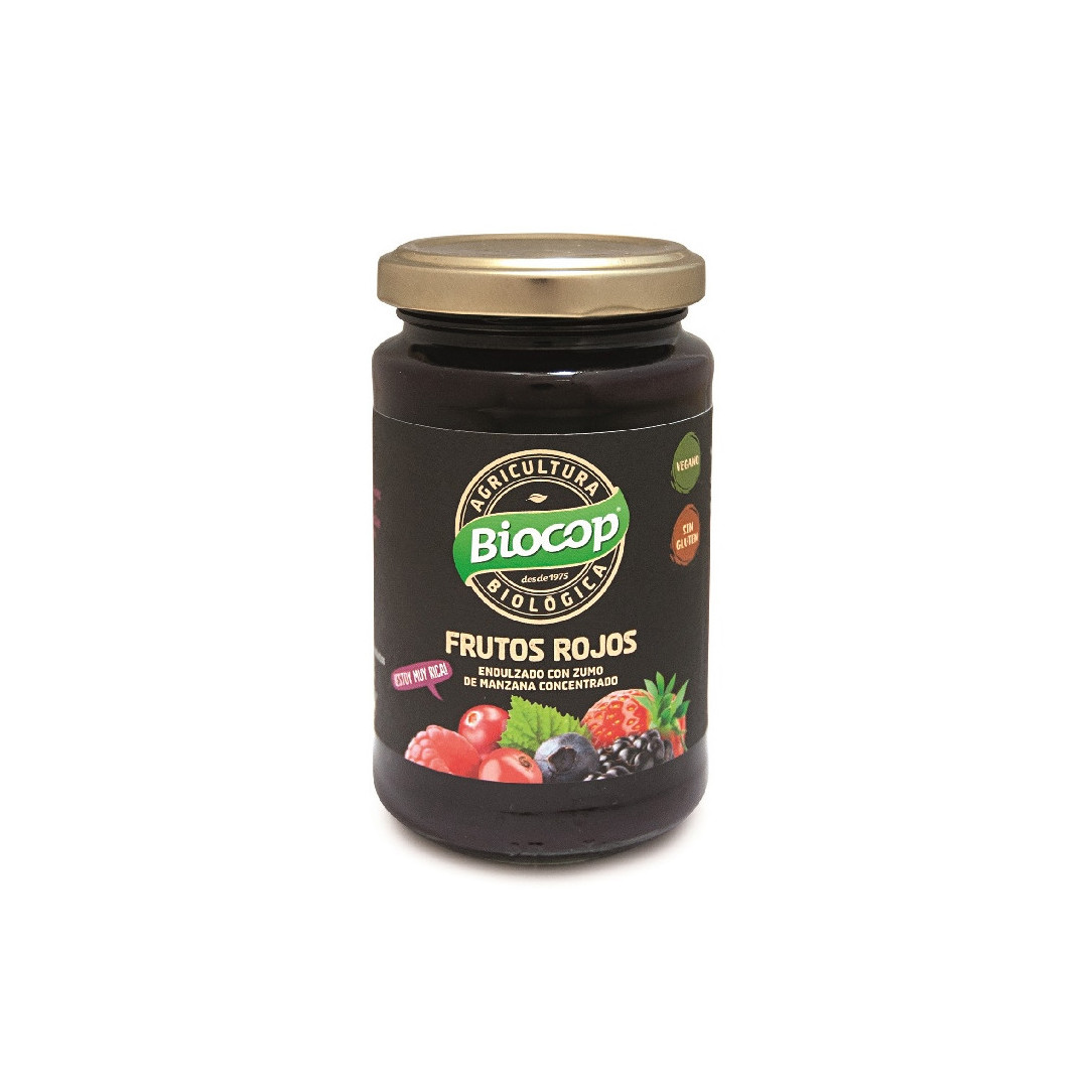 Compota de frutos rojos. Elaborada con frutos rojos maduros mediante cocción mínima para garantizar todo el sabor y aroma de la fruta. Endulzado con concentrado de zumo de manzana.Para untar sobre tostadas o tortitas, también para la elaboración de postres.