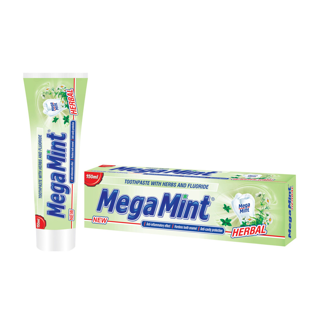 El dentífrico herbal Mega Mint, con extractos de menta y manzanilla, ofrece un efecto antiinflamatorio y ayuda a neutralizar el mal aliento. Protege el esmalte dental, previene la formación de caries y contribuye a mantener una boca fresca y saludable.