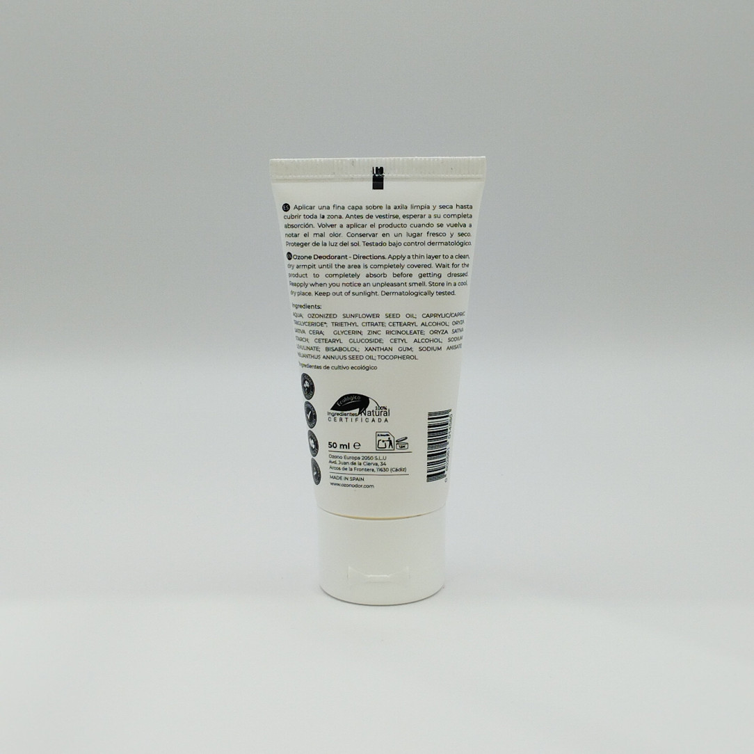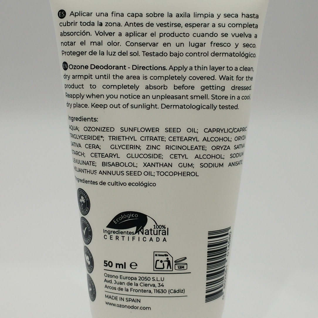 Ozono DOrDesodorante en crema con aceite de girasol ozonizado que neutraliza el olor sin bloquear la transpiración. Sin aluminio, alcohol ni fragancias, ideal para pieles sensibles.