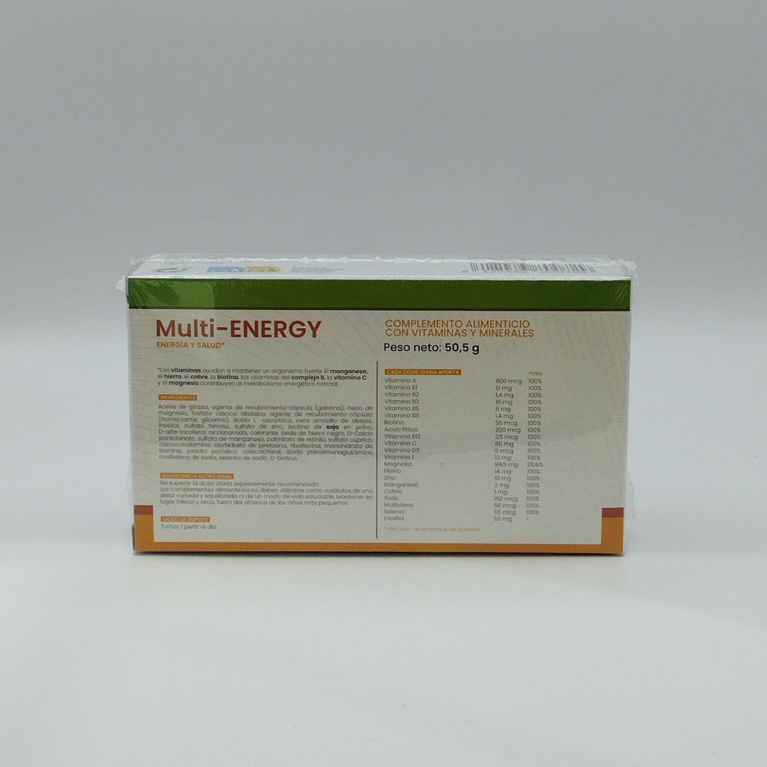 Complemento multivitamínico con 13 vitaminas, 9 minerales, inositol y lecitina de soja que contribuye al metabolismo energético normal y favorece la función del sistema inmunitario. 30 perlas.