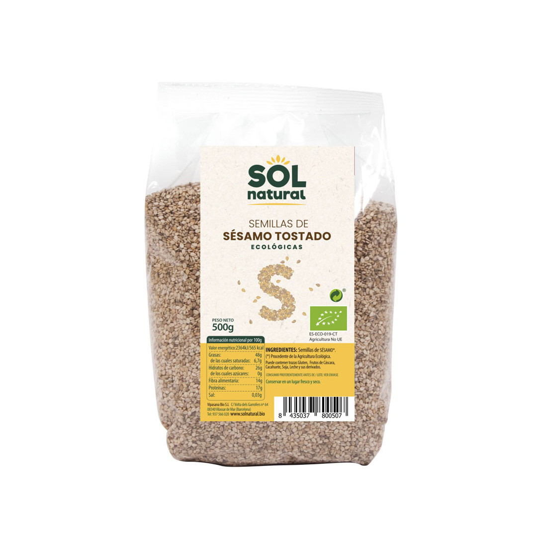 Sol NaturalSemillas de sésamo tostado ecológico con sabor intenso y textura crujiente. Ideales para ensaladas, panes y platos orientales. Rico en proteínas, fibra y grasas saludables.