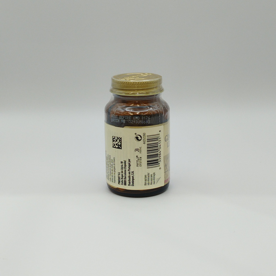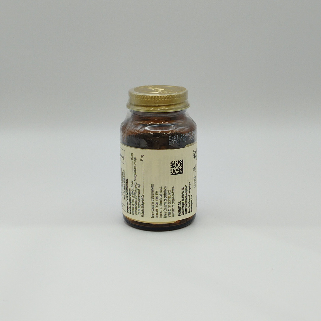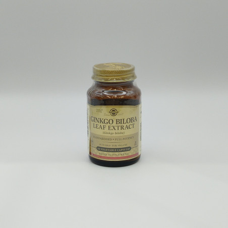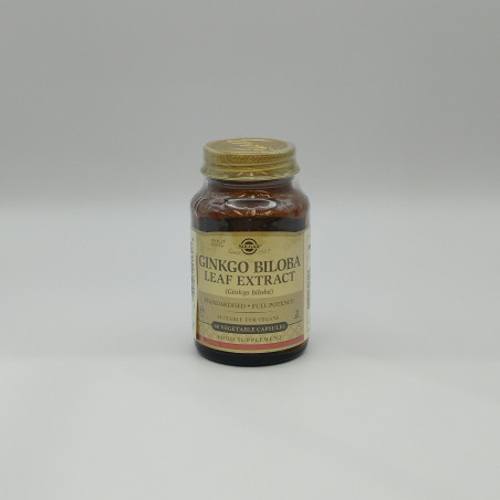 Suplemento natural de extracto de hojas de Ginkgo biloba en cápsulas vegetales de Solgar, una marca reconocida por sus productos naturales de alta calidad y pureza. Cada envase contiene 60 cápsulas.