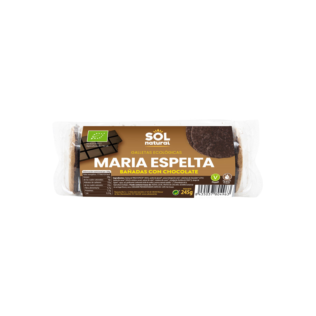 Sol NaturalGalletas María elaboradas con harina de espelta ecológica y bañadas con chocolate. Veganas y sin aceite de palma, perfectas para desayunos y meriendas familiares.