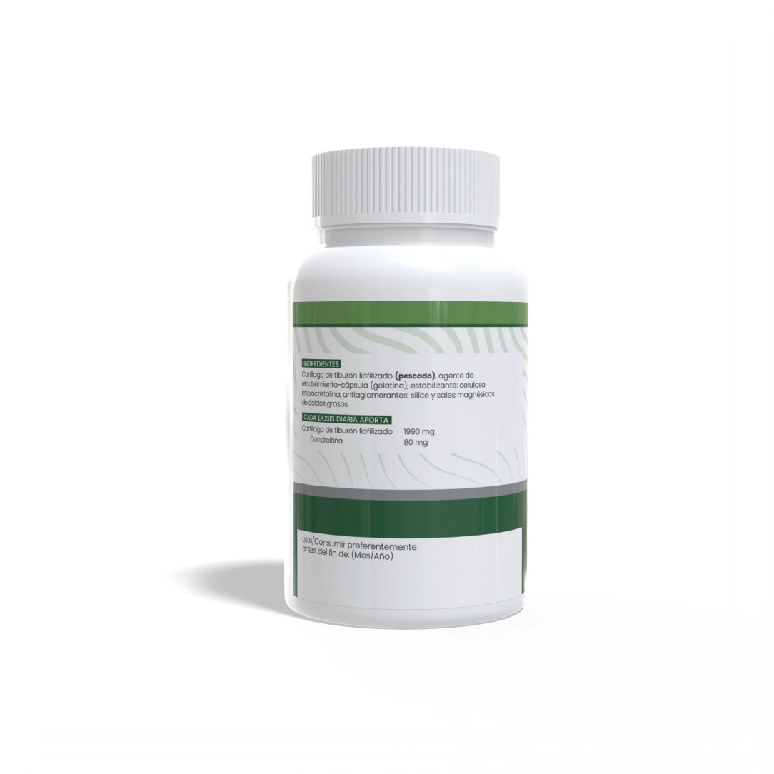 Presentación y composición:90 cápsulas con 741 mg de cartílago de tiburón. Propiedades:Tejido conectivo resistente y elástico etá compuesto principalmente por macro proteínas, calcio, colágeno y glicosaminoglicanos (carbohidrato complejo) Estas sustancias son capaces de penetrar en nuestras articulaciones para prevenir el deterioro articular.El cartílago de tiburón es capaz de inhibir la angiogénesis, fundamental en el tratamiento de procesos tumorales. Modo de empleo: Cápsulas de 741mg, tomar 2-3 al día.3 cápsulas aportan 2223mg de cartílago de tiburón liofilizado