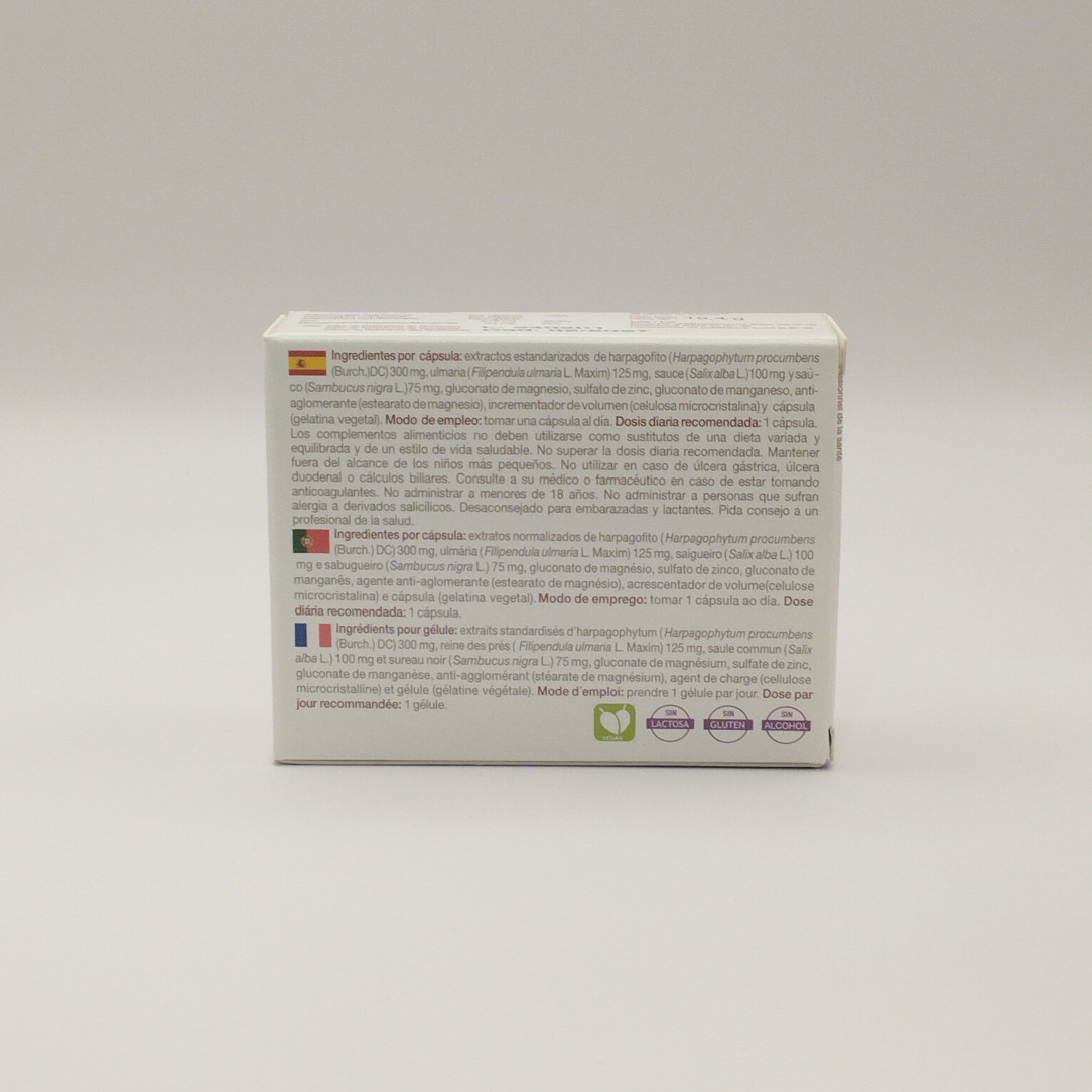 Extractos nebulizados estandarizados de Harpagofito (Harpagophytum procumbens) 300 mg, Ulmaria (Filipendula ulmaria) 125 mg, Sauce (Salix alba) 100 mg y Saúco (Sambucus nigra) 75 mg, gluconato de magnesio, sulfato de zinc, gluconato de manganeso, antiaglomerante (estearato de magnesio), incrementador de volumen (celulosa microcristalina) y envoltura (gelatina).