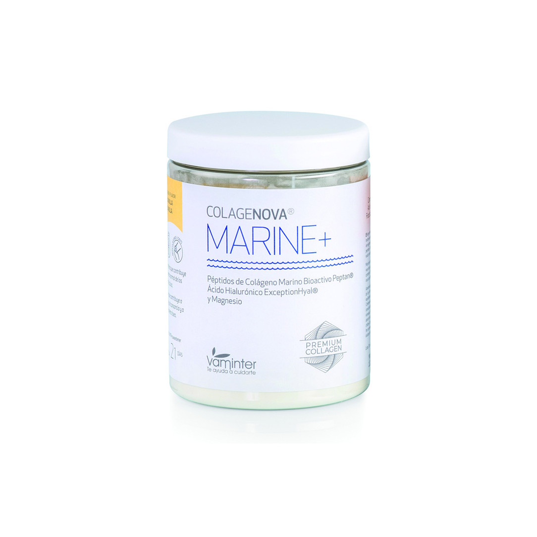 Colagenova Marine es un suplemento alimenticio formulado con péptidos de colágeno hidrolizado de origen marino (Peptan®), ácido hialurónico vegetal y magnesio. Presenta un agradable sabor a vainilla y es de rápida disolución, siendo ideal para fortalecer el sistema óseo y muscular, así como para mejorar la elasticidad y la hidratación de la piel.