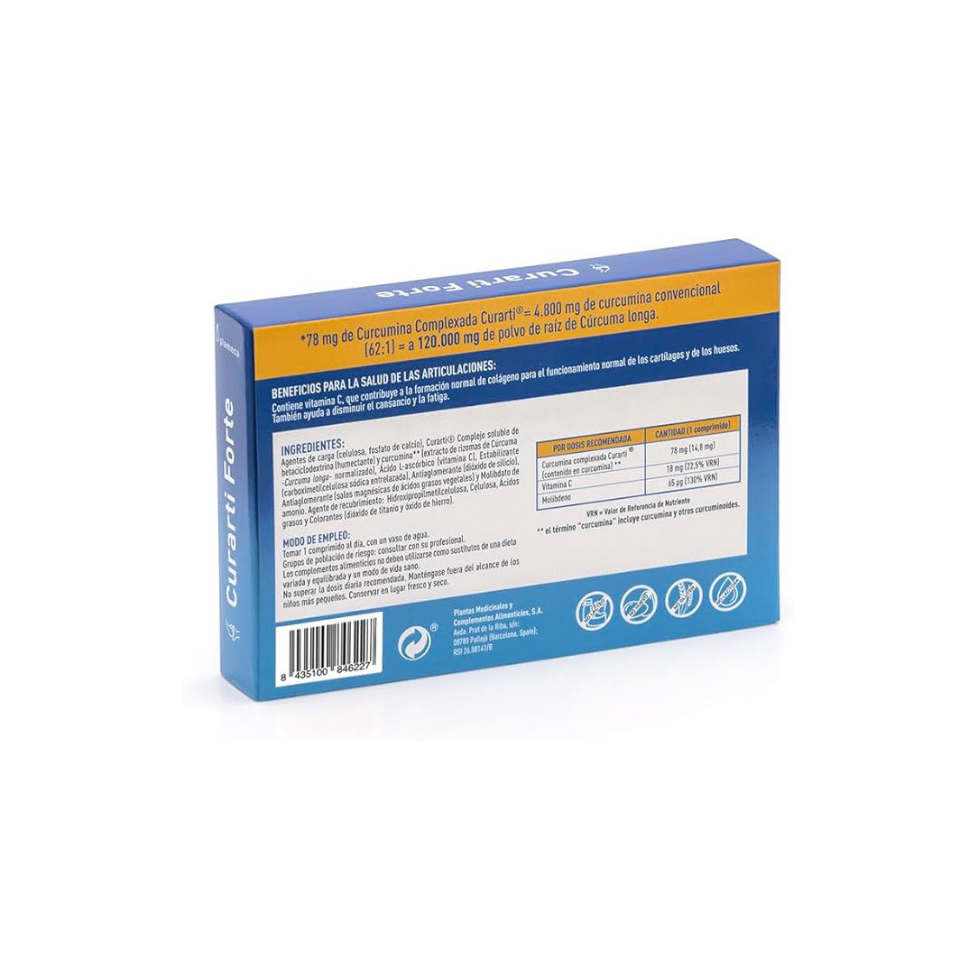 Curarti Forte de Plameca es un complemento alimenticio con curcumina complexada Curarti® y vitamina C. Gracias a su formulación innovadora, la curcumina se presenta en un complejo hidrosoluble con beta-ciclodextrina, lo que mejora notablemente su absorción y biodisponibilidad, ofreciendo una concentración 45 veces superior a la de otros productos similares del mercado.