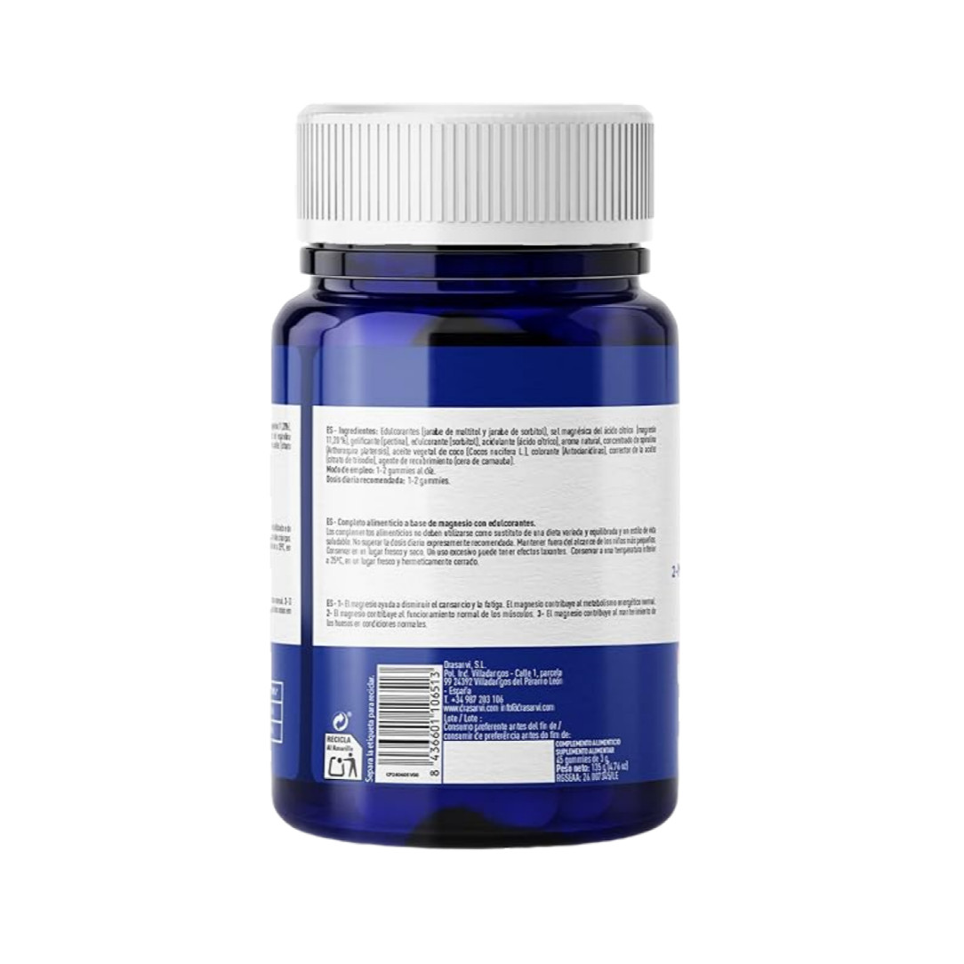 Complemento alimenticio a base de magnesio con edulcorantes. No superar la dosis diaria recomendada. Los complementos alimenticios no sustituyen una dieta variada y equilibrada ni un estilo de vida saludable. Mantener fuera del alcance de los niños. Un consumo excesivo puede producir efectos laxantes. Conservar en un lugar fresco, seco y herméticamente cerrado, a una temperatura inferior a 25 ºC.