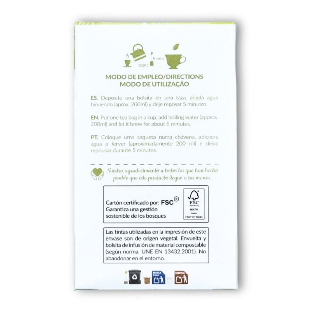 Coloca 1 bolsita en una taza (≈200 ml). Vierte agua hirviendo y deja reposar 5 minutos. Retira el filtro y disfruta. Opcional: endulzar al gusto.