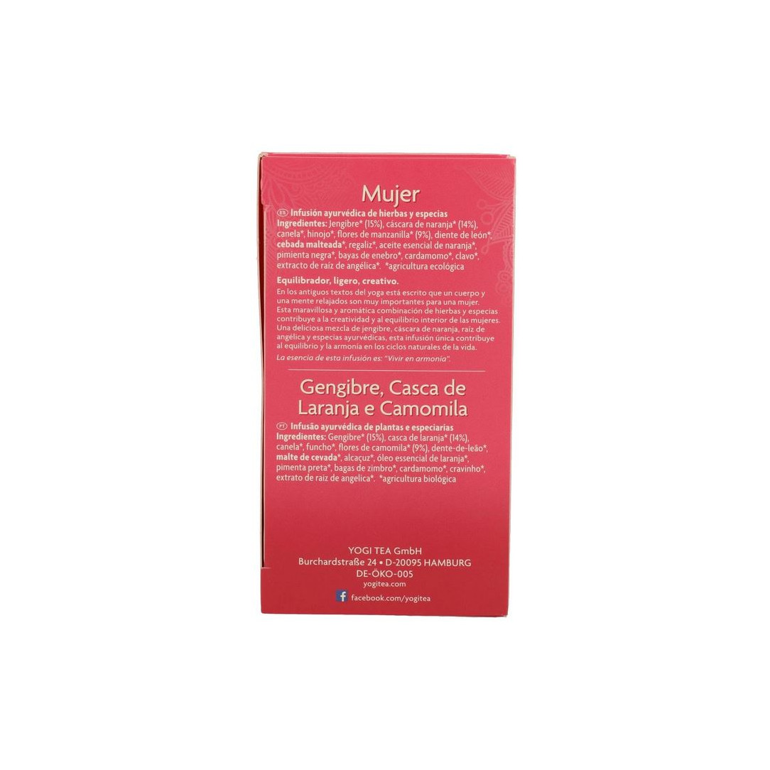Yogi Tea Mujer es una infusión ayurvédica formulada para apoyar el bienestar femenino en todas las etapas de la vida. Su equilibrada mezcla de hierbas y especias como jengibre, cáscara de naranja, raíz de angélica y canela ofrece una experiencia aromática que promueve la armonía interior, acompañando suavemente los ciclos naturales del cuerpo femenino.