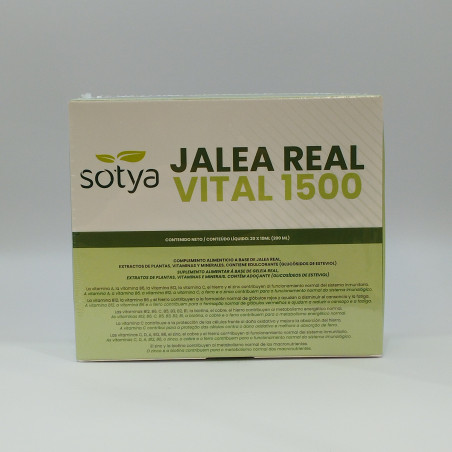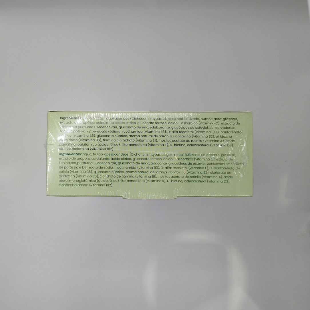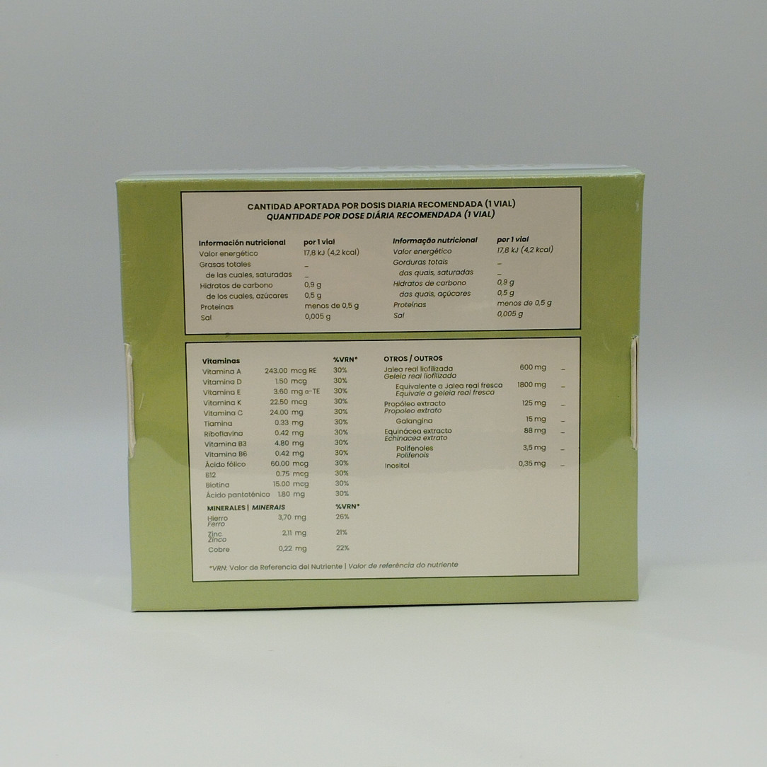 Complemento alimenticio con azúcares y edulcorantes que combina jalea real con extracto de própolis, equinácea y un completo complejo vitamínico. Cada vial aporta 1500 mg de jalea real junto con vitaminas A, B, C, D, E y K, además de minerales como hierro, zinc y cobre.