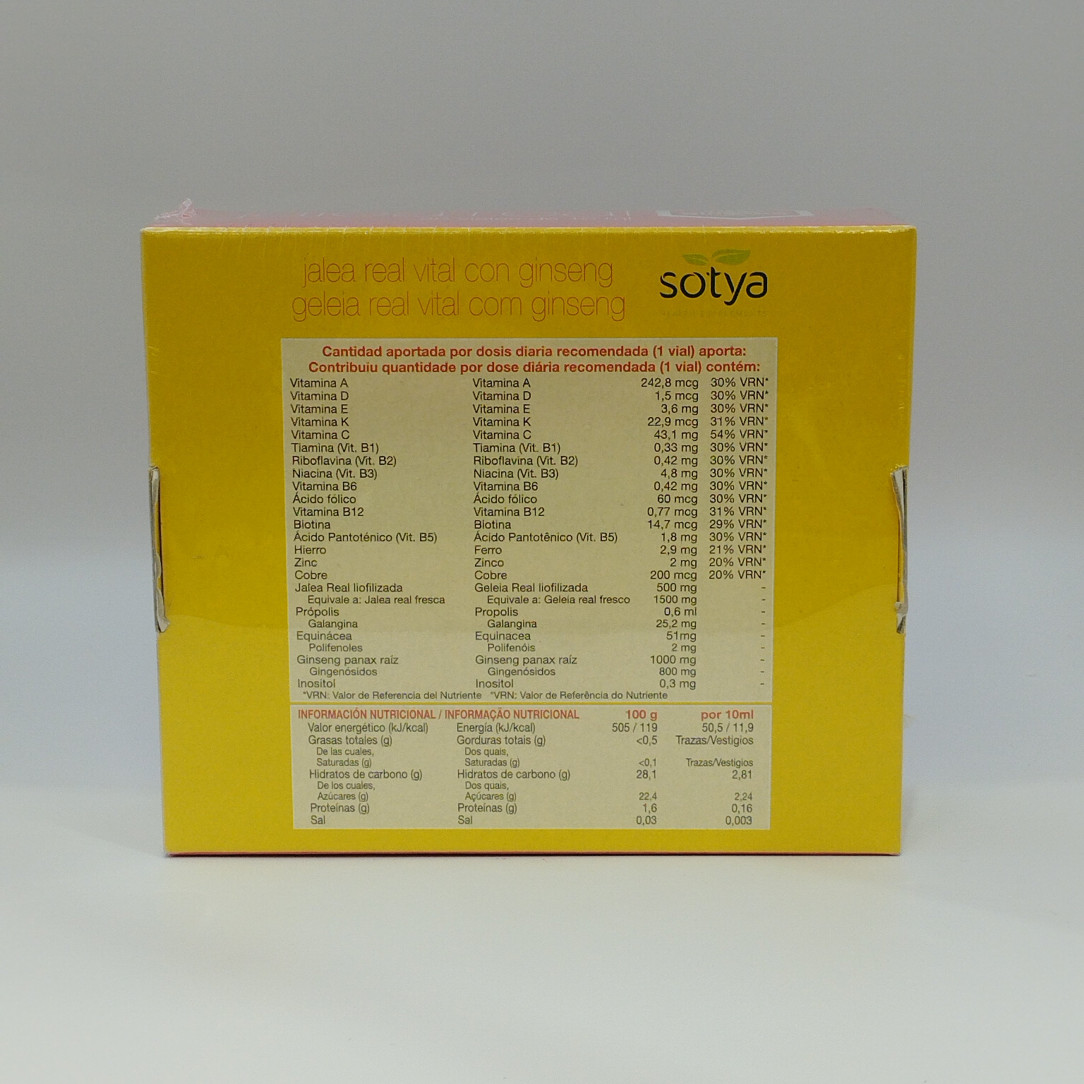 La Jalea Real Vital con Ginseng de Sotya es un complemento alimenticio que combina jalea real y ginseng en un formato cómodo de viales bebibles. Esta formulación aprovecha las propiedades tradicionales de ambos ingredientes naturales para crear un producto que contribuye al bienestar general.
