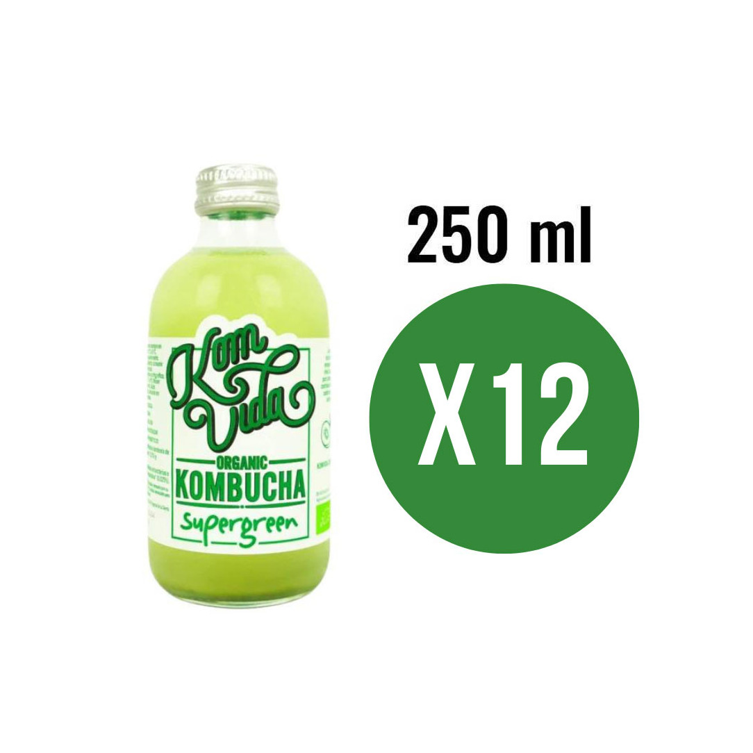 La Kombucha Supergreen Bio de Komvida es una bebida probiótica elaborada a base de té fermentado con scoby, zumo de kiwi, pepino y espirulina. Naturalmente refrescante y con finas burbujas, contribuye a la salud digestiva y al bienestar general.