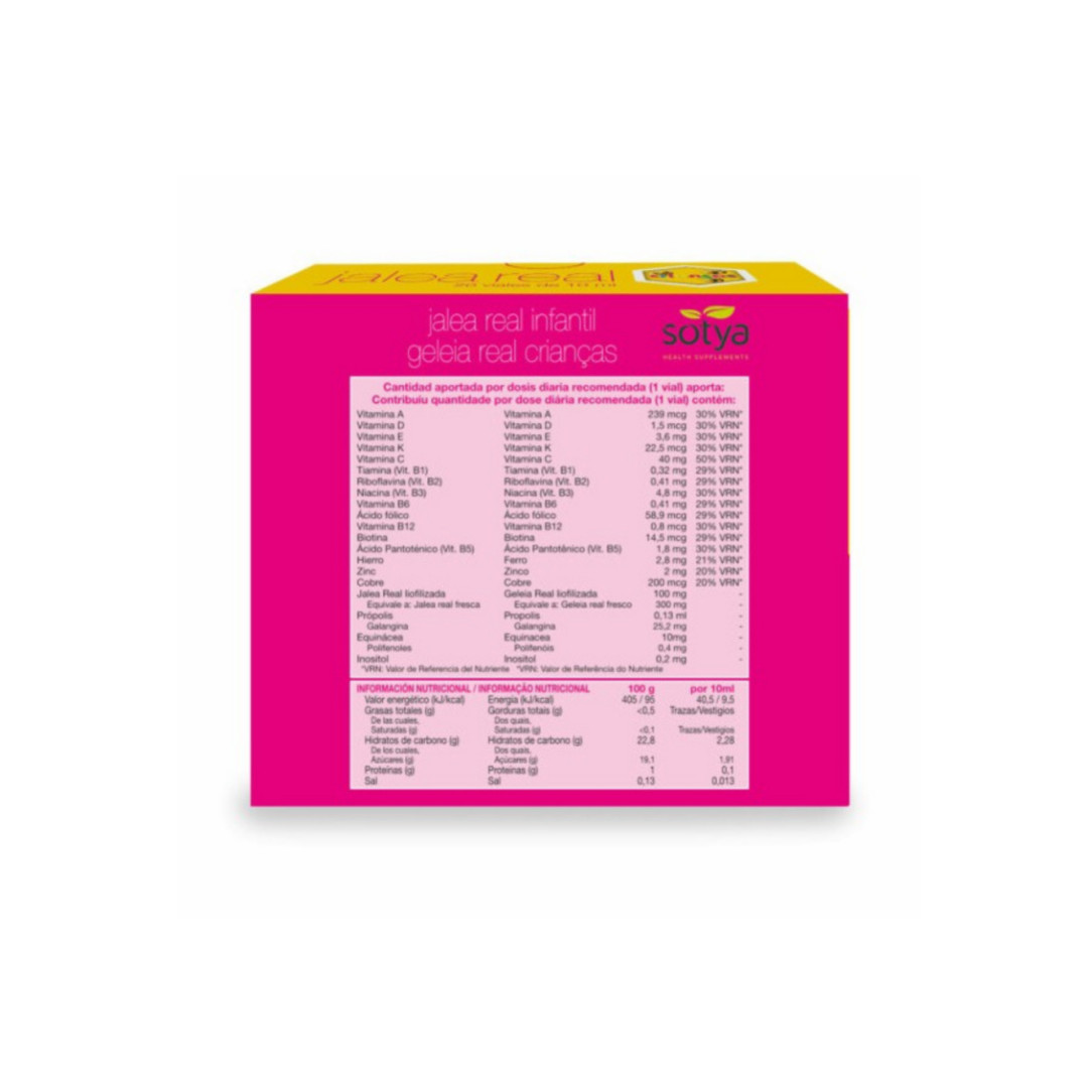 Agua, fructosa, gructooligosacáridos (Achicoria,raiz), extracto de própolis, jalea real, acidulante, gluconato de hierro, acido l-ascórbico (vitamina c), ascorbato de sodio, gluconato de zinc, extracto de equinacea, niacina (vitamina b3), vitamina b5, acetato de retinilo, gluconato de cobre, aroma de fresa, riboflamina (vitamina b2), clorhidrato de piridoxina (vitamina b6), clorhidrato de tiamina (vitamina b1), inositol,colecalciferol (vitaminaD), maltodextrina, acido folico, vitamina b12, vitamina K y D-biotina.
