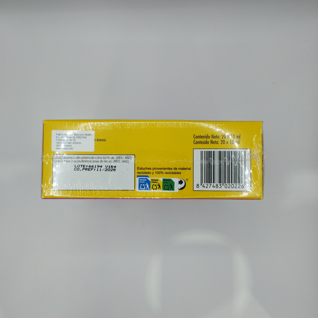 La Jalea Real infantil con vitaminas de Sotya es un complemento alimenticio especialmente formulado para los más pequeños. Cada envase contiene 20 viales de 10ml con una combinación de jalea real, vitaminas esenciales y minerales que apoyan el bienestar de los niños. Su presentación en viales facilita la dosificación y administración.