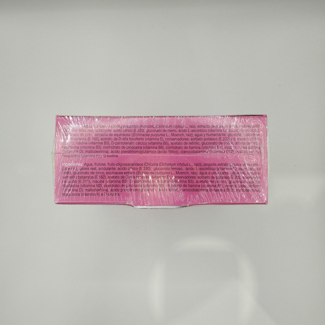 Agua, fructosa, fructooligosacáridos (achicoria, raíz), extracto de própolis, jalea real, acidulante, gluconato de hierro, ácido L-ascórbico (vitamina C), ascorbato de sodio, gluconato de zinc, extracto de equinácea, niacina (vitamina B3), vitamina B5, acetato de retinilo, gluconato de cobre, aroma de fresa, riboflavina (vitamina B2), clorhidrato de piridoxina (vitamina B6), clorhidrato de tiamina (vitamina B1), inositol, colecalciferol (vitamina D), maltodextrina, ácido fólico, vitamina B12, vitamina K y D-biotina.