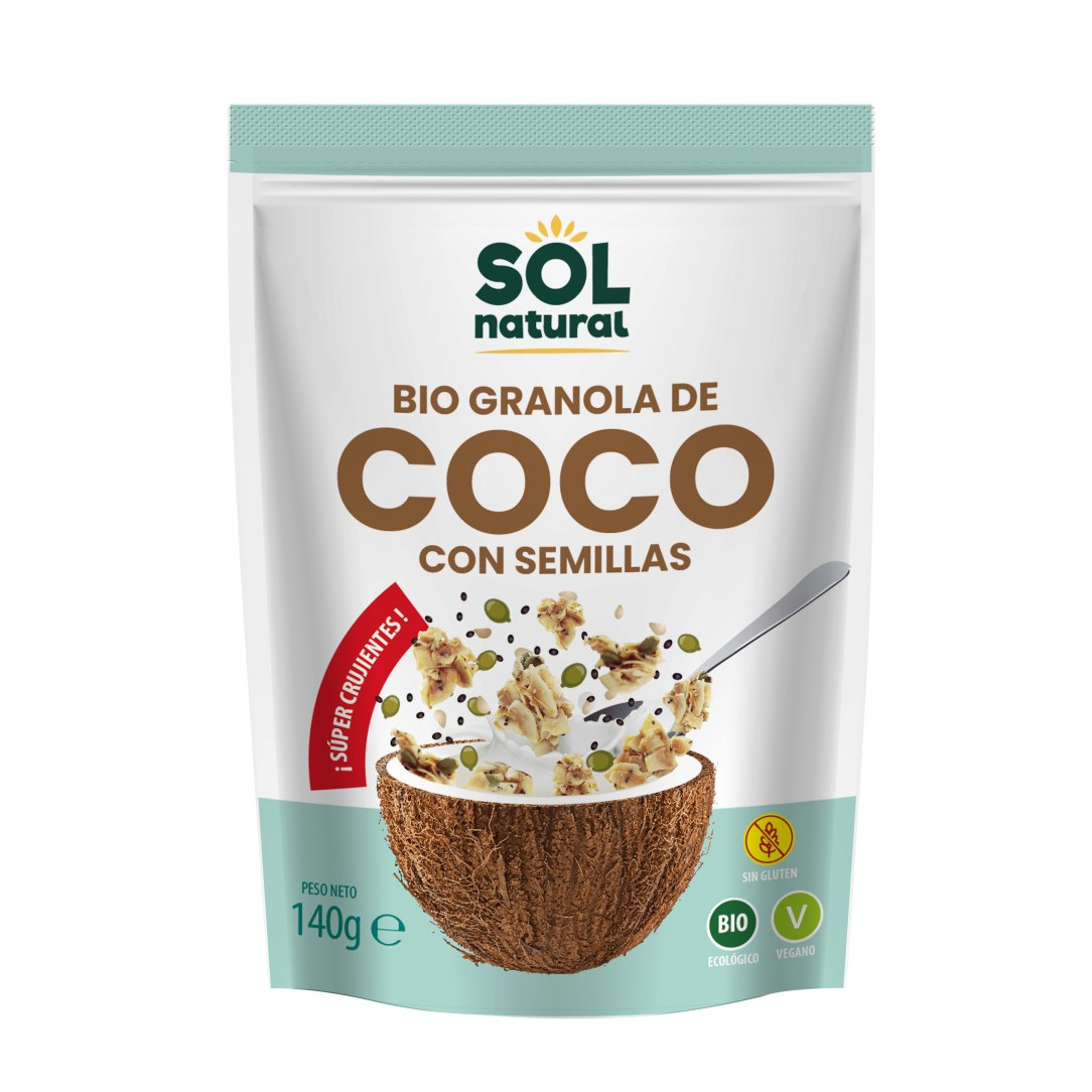 Sol NaturalGranola crujiente de coco tostado con semillas de calabaza, girasol y chía. Ideal como snack o topping. Ecológica, vegana y sin gluten en formato de 140g.