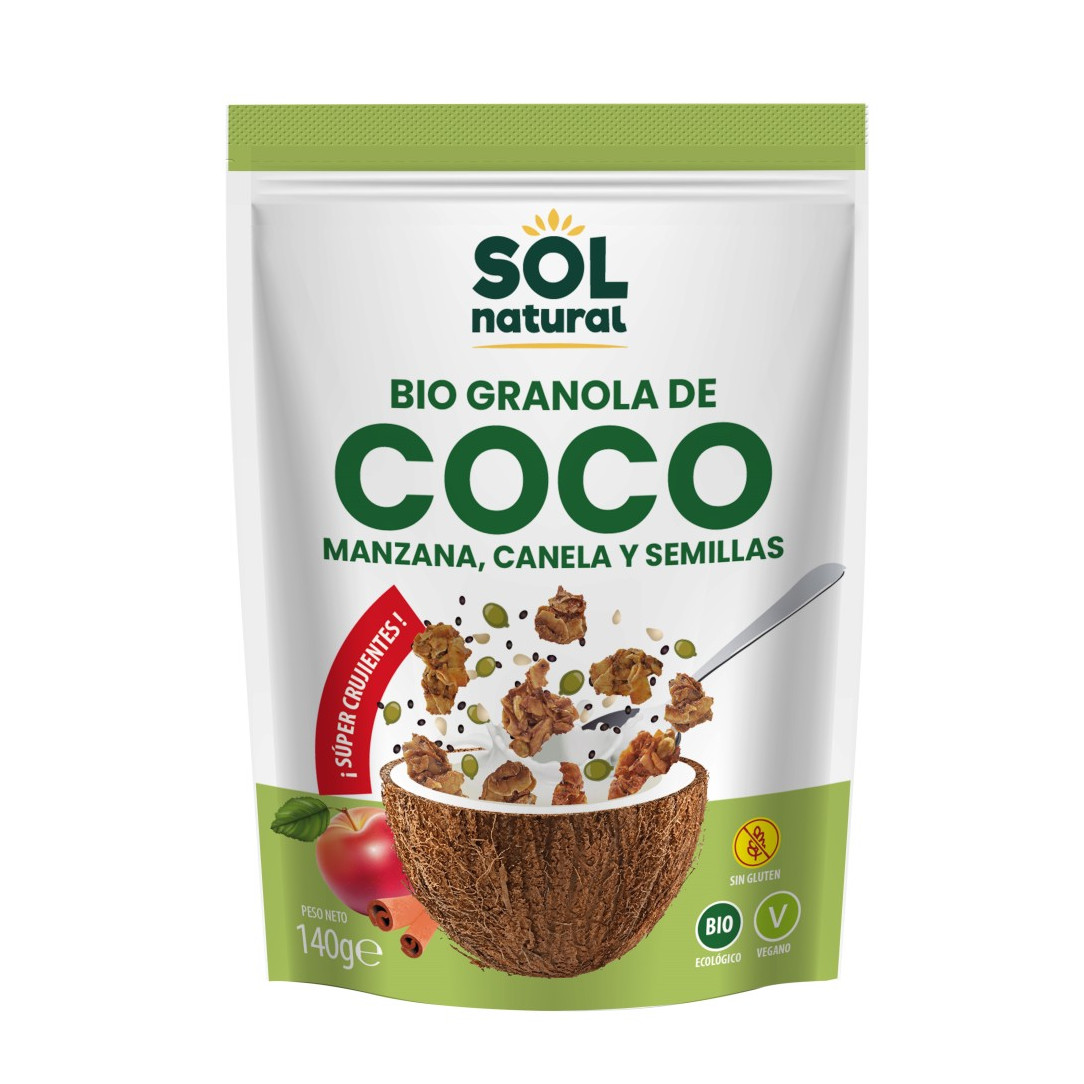Sol NaturalGranola crujiente con chips de coco, manzana, canela y semillas de ingredientes ecológicos. Perfecta como snack o con leche y yogur. Vegana y sin gluten.