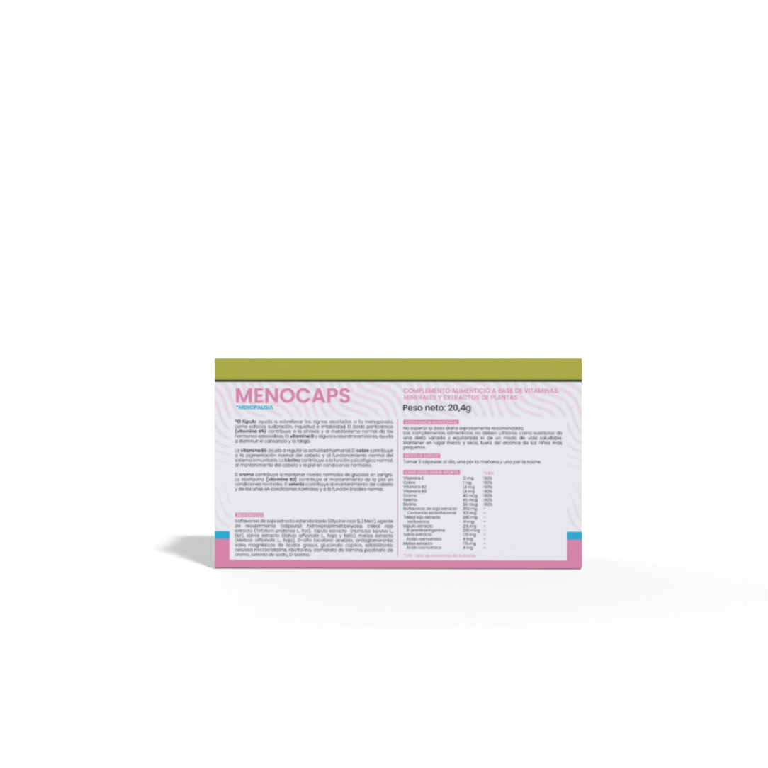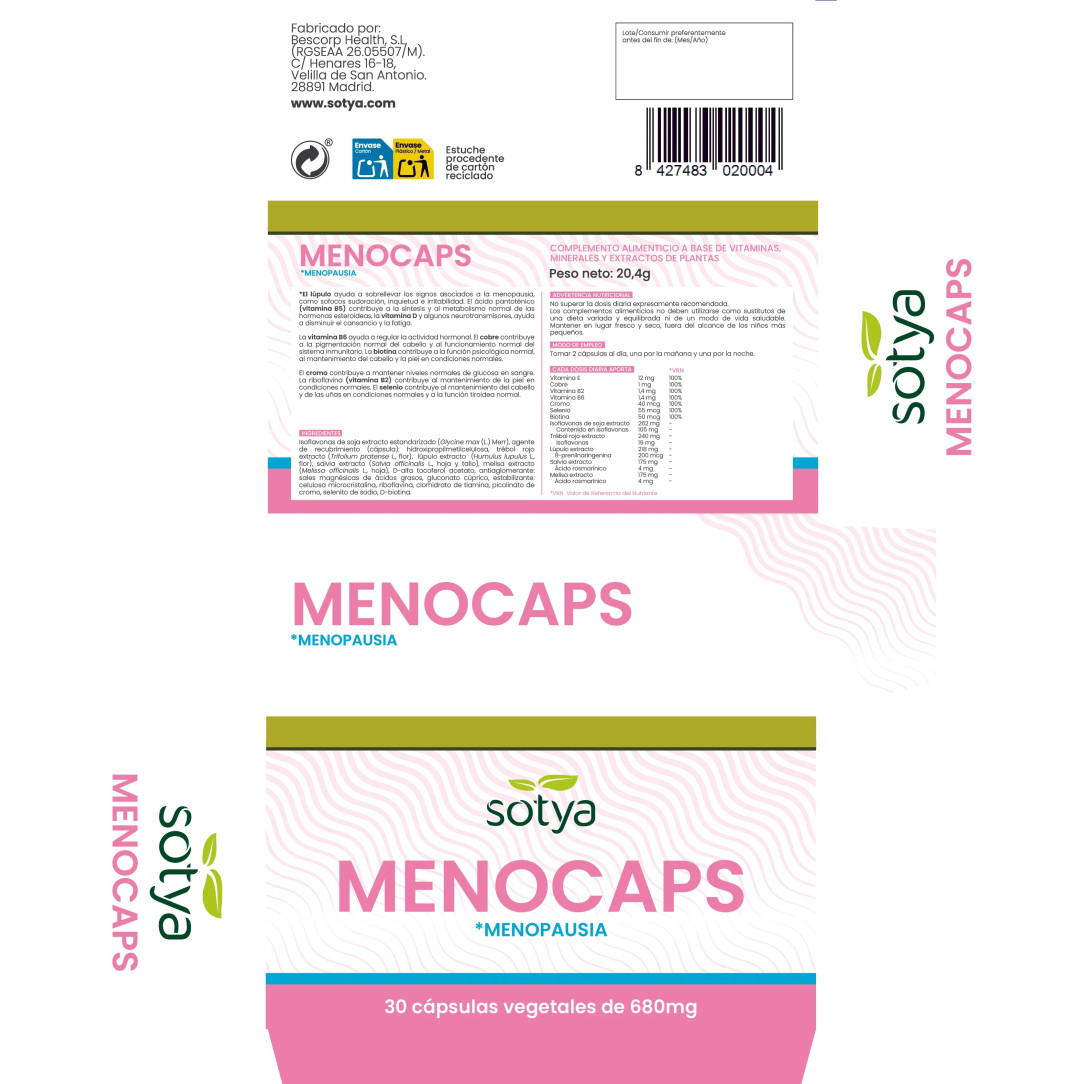 Menocaps de Sotya es un complemento alimenticio a base de isoflavonas de soja, trébol rojo y vitamina E, diseñado para aliviar los síntomas de la menopausia. En general, es un producto bien tolerado, pero algunos de sus ingredientes (como las isoflavonas y el trébol rojo, que actúan como fitoestrógenos) pueden provocar en personas sensibles efectos leves como dolor de cabeza, molestias digestivas o sofocos.