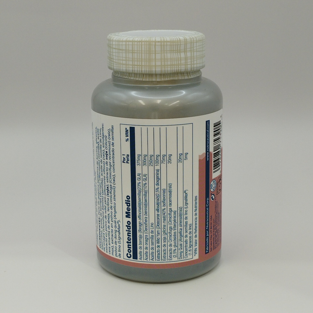 Aceite de borraja, aceite de onagra, aceite de semilla de lino orgánico, ñame silvestre (Dioscorea villosa) raíz, soja no GMO (extracto de haba de Glycine max), dong quai (raíz de Angelica sinensis), raíz de cimífuga racemosa, lecitina de soja, cera de abeja. Perla: gelatina, glicerina y algarroba.
