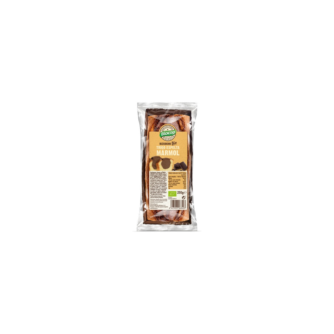 Bizcocho marmolado artesanal elaborado con trigo espelta ecológico y cacao de comercio justo. Presenta una textura esponjosa y un sabor equilibrado entre vainilla y chocolate, endulzado con azúcar moreno de caña de comercio justo. Elaborado con huevos ecológicos de corral y sin aceite de palma.