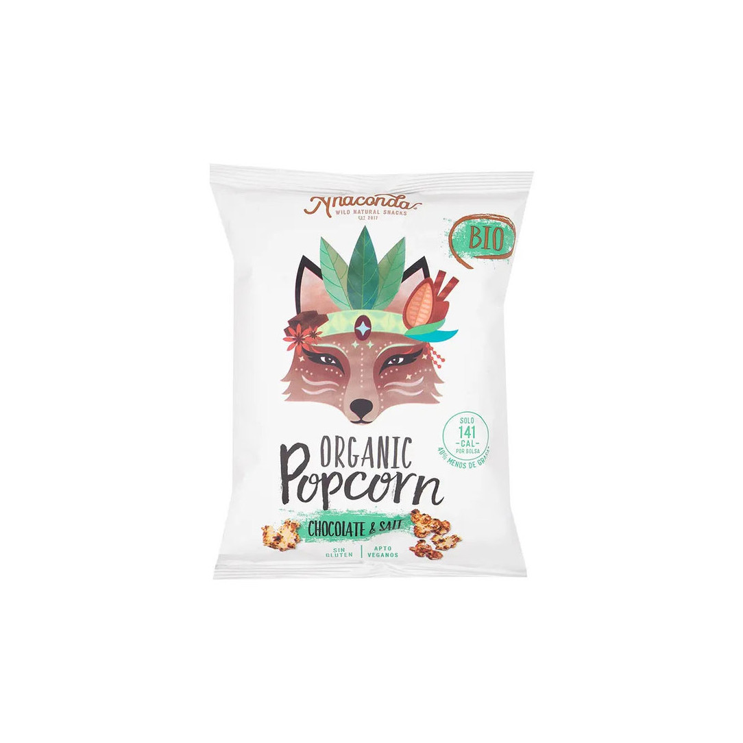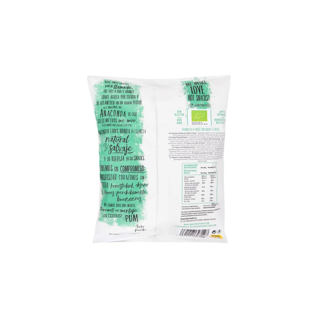 AnacondaSnack ecológico de palomitas con el equilibrio perfecto entre cacao suave y sal marina. Elaboradas con maíz non GMO y AOVE ecológico en formato individual de 30g.