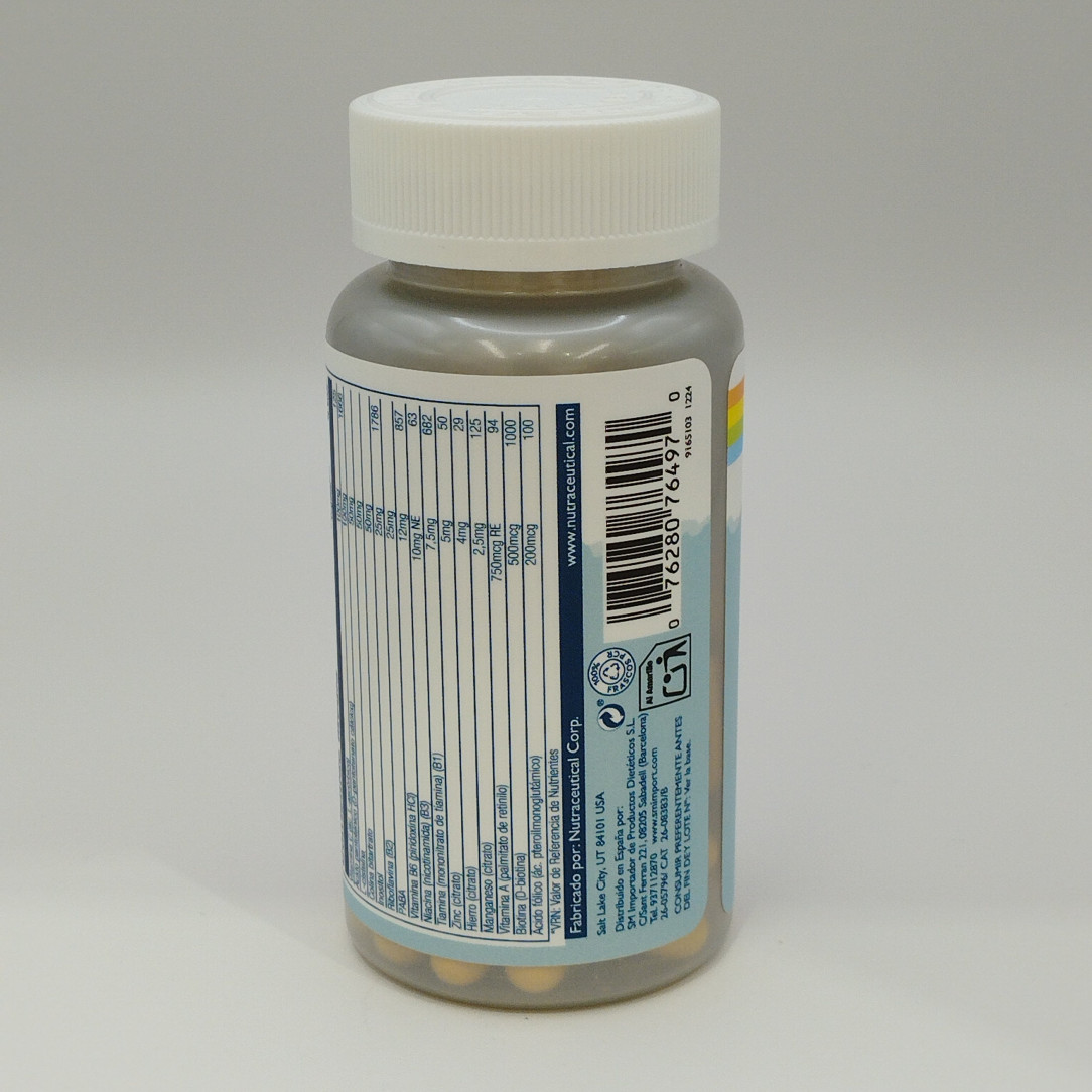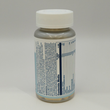 Vitamina C (ácido ascórbico), ácido pantoténico (calcio d-pantotenato), cápsula de celulosa vegetal, L-cisteina, colina bitartrato, inositol, vitamina B2 (riboflavina), vitamina B6 (piridoxina HCI), PABA (ác.paraminobenzoico), vitamina B3 (niacinamida), vitamina B1 (tiamina mononitrato), zinc (citrato), hierro (citrato), agente de carga: celulosa; manganeso (citrato), harina de arroz, antiaglomerante: estearato de magnesio, magnesio y dióxido de sílice; vitamina A (retinol), croscarmelo sódica, biotina (d-biotina), ácido fólico (ácido pteroilmonoglutámino), alfalfa (Medicago sativa) (hoja), berros (Nasturtium officinale) (hoja), perejil (Petroselinum crispum) (hoja).