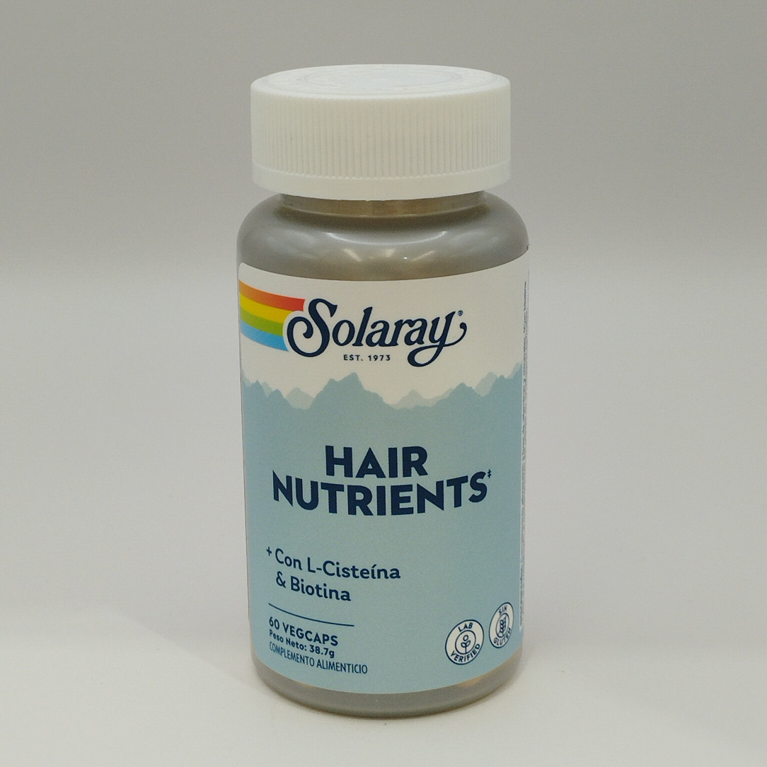Hair Nutrients de Solaray es un complemento alimenticio formulado con una combinación de multinutrientes diseñada para el cuidado capilar. Esta fórmula contiene L-Cisteína, un componente importante para la síntesis de la queratina, junto con zinc, hierro y vitaminas del grupo B que contribuyen al mantenimiento normal del cabello.