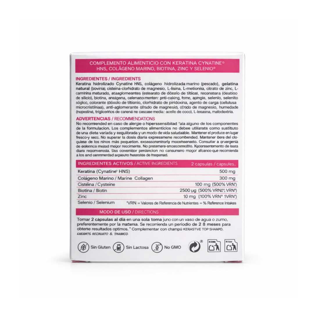 Queratina hidrolizada (Cynatine HNS), colágeno hidrolizado marino, bisglicinato de zinc, selenio metionina, biotina; emulsionante: estearato de magnesio vegetal; antiaglomerante: sílice; cápsula: gelatina, colorante: dióxido de titanio.