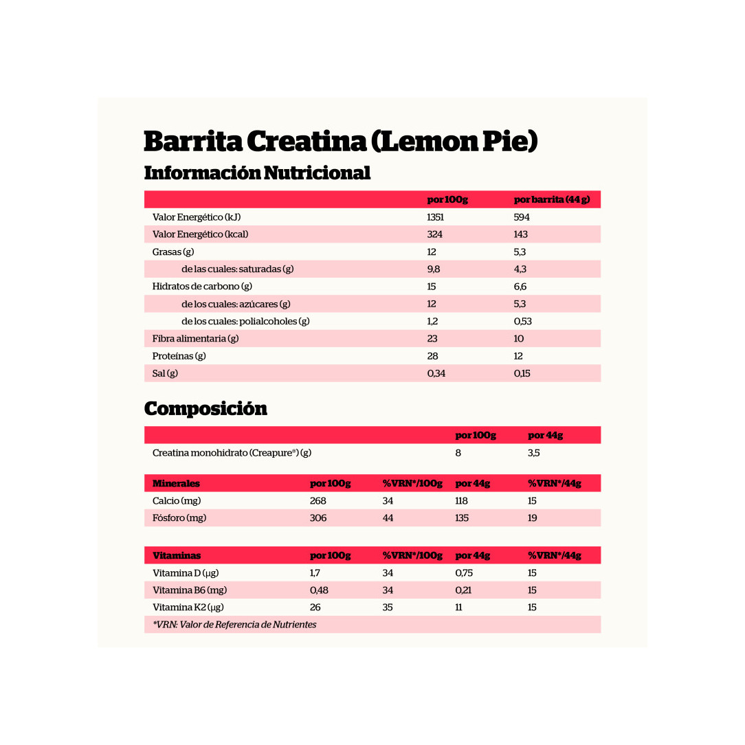 - Aporta 3,5 g de creatina monohidrato Creapure® por barrita.